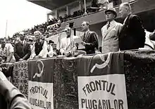 Відносини між Фронтом і комуністами часом випробовувались: після свого першого з'їзду (липень 1945 р.) партія закликала до збереження дрібних сільськогосподарських ділянок, що перебувають у приватній власності, та добровільного кооперативного господарства замість колективізації, яку пропагувала PCR;[11] в період, відомий як «королівський страйк» (початок восени 1945 р. І ознаменований відмовою короля Михайя I підписувати своє ім'я під законодавством, яке пропагує уряд. Зрештою, Фронт поступився комуністичним вимогам[12] (як політик, чия кар'єра пережила загибель групи, Гроза продовжував епізодично конфліктувати з PCR).[13]