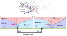 Фронти оклюзії (складні фронти) утворюються при поєднанні холодного і теплого фронтів циклону. Таке поєднання відбувається тому, що холодний фронт переміщується трохи швидше від теплого і доганяє останній спочатку у вершині теплого сектора. При цьому зливаються і хмарові системи обох фронтів. Наступний розвиток хмарової системи залежить від співвідношення температур повітряних мас по обидві сторони утвореного зімкнутого фронту.