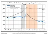 Динаміка населення з 1875 року в сучасних кордонах (Синя лінія: населення; Пунктир: відносна порівняльна динаміка населення землі Бранденбург; Сірий фон: період Третього рейху; Помаранчевий фон: період НДР)