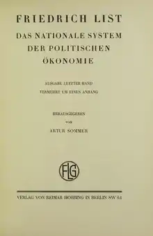 Основною працею Фрідріха Ліста є написана ним у Парижі книжка «Національна система політичної економії, міжнародної торгівлі, торгова політика й німецький митний союз» (1841), що ввібрала всі ідеї, викладені ним у безлічі памфлетів та статей. Цю книжку спрямовано на захист протекціонізму як обов'язкової умови становлення економічної могутності нації.