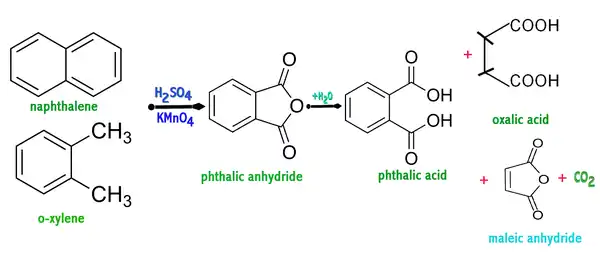 У промисловості фталеву кислоту отримують окисненням нафталіну або о-ксилолу з каталізатаром, який містить оксид ванадію. При цьому утворюється ангідрид фталевої кислоти, який легко приєднує воду[3]: