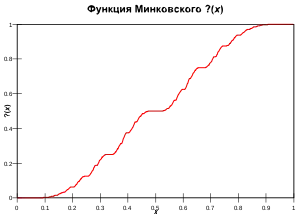 Функція «знак питання» Мінковського — побудована Германом Мінковським монотонна сингулярна функція на відрізку , яка має низку чудових властивостей. Так, вона взаємно-однозначно і зі збереженням порядку переводить квадратичні ірраціональності (тобто, числа вигляду де і раціональні) на відрізку у раціональні числа на тому ж відрізку, а раціональні числа — в двійково-раціональні. Вона пов'язана з рядами Фарея, ланцюговими дробами, і дробово-лінійними перетвореннями, а її графік має низку цікавих симетрій.