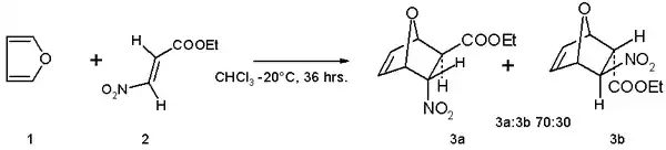Фуран виступає дієном в реакції Дільса—Альдера з електронно-акцепторними дієнофілами, такими як етиловий ефір-(2E)-3-нітроакрилату.[6] Продуктом реакції є суміш ізомерів з переважанням ендо-ізомеру: