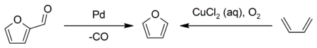В промисловості фуран отримують декарбонілюванням фурфуролу, чи окисленнням бутадієну в присутності мідного каталізатора:[4]