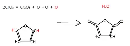 При окисненні фурану утворюється малеїновий ангідрид. Окиснення проводиться в нейтральному або слаболужному середовищі. В якості окисника використовується дихромат калію або оксид хрому(VI):