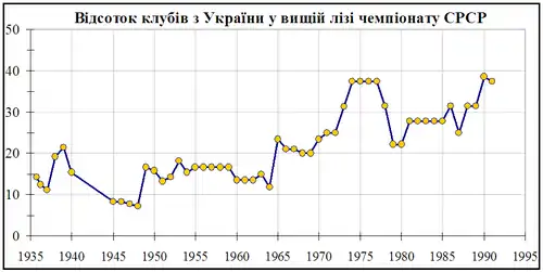 У 1974–1977 роках серед 16 учасників вищої ліги чемпіонату СРСР було 6 команд з УРСР, тобто — 37,5%. Це був найвищий показник за всі роки існування чемпіонату. Вища частка буде лише у першості 1990, коли від участі у чемпіонаті відмовляться клуби Прибалтики та Грузії.