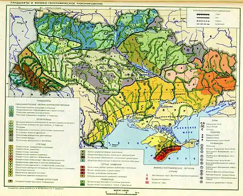 Основні риси ландшафтної структури території України визначаються її розташуванням переважно в помірному поясі. Лише для південного берега Криму характерні риси субтропічного поясу. Територія України займає південно-західну частину Східноєвропейської фізико-географічної країни, частини Карпатської і Кримську гірські фізико-геогр. країни. У межах Східноєвропейської фізико-географічної країни на тер. республіки по переважанню певних типів і підтипів ландшафтів виділяють три фізико-геогр. зони. За ступенем континентальності клімату, загальним характером рельєфу і історії формування геолого-геоморфологічної основи природних комплексів зони ділять на провінції. У провінціях виділяють фізико-географічні області (по положенню в межах значних оротектонічних елементів); області — у зв'язку з місцевими відмінностями в характері прояву інтенсивності і спрямованості сучасних природних процесів — ділять на фізико-географічні райони.