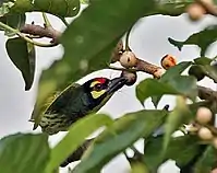 Пташка Psilopogon haemacephalus їсть плоди фікуса зеленого