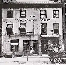 Девід Ріттенхаус, американський вчений, був призначений першим директором монетного двору президента Джорджа Вашингтона. Два лоти були придбані Ріттенхаус 18 липня 1792, на Сьомій вулиці і 631 Філберт Стріт в Філадельфії за $ 4,266.67. На наступний день, знесення покинутому віскі винокурні на майно почалося. Робота Фонду почалася 31 липня і 7 вересня, перший будинок був готовий до установки плавильної печі. Корюшка будинок був першим громадським будівлею зведена урядом Сполучених Штатів. Триповерхова цегляна будівля з видом Сьомий стріт була побудована кілька місяців по тому. Вимірювання близько 37 футів (11 м) в ширину на вулиці, це тільки продовжений назад 33 футів (10 м). Золото і срібло для монетного двору містилися в підвальних сховищах. На першому поверсі розміщені депозитні і зважуванням номера, а також прес-центр, де карбування монет мали місце. офіційні офіси Mint були на другому поверсі, а також аналіз офіс був розташований на третьому поверсі. Фотографія будівлі Сьомий стріт прийнято близько 1908 показують, що до цього часу 1792 рік, а слова "Ye Olde монетний двір" (в лапках) були намальовані на фасаді.