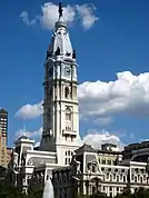 Краєвид із хмарочосами Філадельфії. Ліворуч — старовинна мерія міста з вежею.