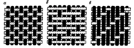 Фільтрувальну тканину виготовляють з двох систем паралельних ниток, розташованих перпендикулярно між собою. Залежно від взаємного розташування ниток можна виготовити багато різних переплетень. Кожне переплетення (рис. 1.38) характеризується значенням рапорту R, тобто найменшим числом ниток, після якого повторюється порядок переплетень. Основні види переплетень — полотняне, саржеве і сатинове. У полотняного переплетення R = 2. Тканини з таким переплетенням володіють високою затримуючою здатністю, але мають підвищений гідравлічний опір. Застосовують такі тканини на фільтр-пресах. Тканини саржевого переплетення мають R>3. Вони володіють меншою затримуючою здатністю, але легше регенеруються. Більшість фільтротканей має саржеве переплетення. При сатиновому переплетенні R>5. За міцністю і затримуючій здатності вони поступаються полотняним і саржевим.