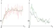 (зазначте, що тут немає члена , оскільки ми не маємо відомих впливів керування); натомість ми вважаємо, що ak є наслідком невідомого впливу, і прикладає цей вплив до вектора стану), де