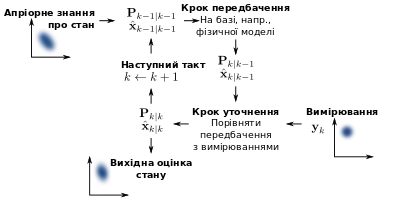 - , апостеріорною оцінкою стану в момент часу k при заданих спостереженнях по момент часу k включно;
