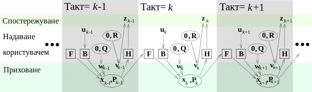 Модель фільтру Калмана припускає, що справжній стан у момент часу k виводиться зі стану в (k − 1) відповідно до