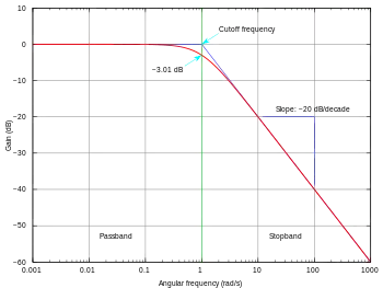 На малюнку праворуч зображена схема фільтру на основі RC-ланцюга, який відсікає високочастотні коливання. Реактивний опір конденсатора зменшується з частотою, а отже конденсатор пропускає тільки високочастотні сигнали, й тим краще, чим вища частота. У результаті на високих частотах конденсатор шунтує сигнал. На виході такого чотириполюсника залишиться лише сигнал низької частоти.