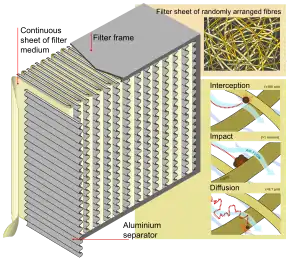 Фільтри HEPA складаються із мережі випадково розташованих волокон. Волокна зазвичай, виробляються зі склопластику та мають діаметр від 0,5 до 2,0 мкм. Найважливіші чинники, які слід враховувати у фільтрі HEPA, це діаметр волокон, товщина фільтра та швидкість руху частинок. Простір між волокнами значно більше 0,3 мкм, але це не означає, що крізь нього можуть проходити частинки з меншим діаметром. На відміну від мембранних фільтрів де застосовується такий розмір пор, коли частинки розміром, більшим за отвір або відстань між волокнами, взагалі не можуть проходити крізь них, фільтри HEPA розраховані на значно менші забруднювачі та частинки, котрі потрапляють у пастку (прилипають до волокон) за допомогою таких механізмів: