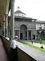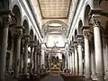 Бічні нави базиліки — не наскрізні, як це було традиційно, а утворені ланцюгом однакових квадратних приміщень, перекриті склепіннями. Античні за пропорціями, силуетом і малюнком капітелей колони легко несуть тягар, через них перекинуті арки, весь простір розчленований з математичною ясністю — уникнуто всього, що тисне, роз'єднує. Проста орнаментика, частково антична, частково флорентійської традиції, частково — винайдена самим Брунеллескі, вносить відбиток легкості, гармонійності, і весь настрій цієї церковної будівлі — настрій незатьмареної життєрадісності, наївної радості буття.