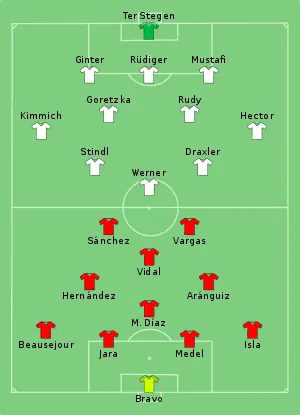- Tactical Line-up – Final – Chile-Germany (PDF). FIFA.com. Fédération Internationale de Football Association. 2 липня 2017. Архів оригіналу за 30 серпня 2017. Процитовано 2 липня 2017.