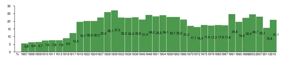 Нинішній голова, Марій Ківініемі, очолювала урядову коаліцію, до якої входили також такі партії, як Національна коаліція, Зелений союз та Шведська народна партія.