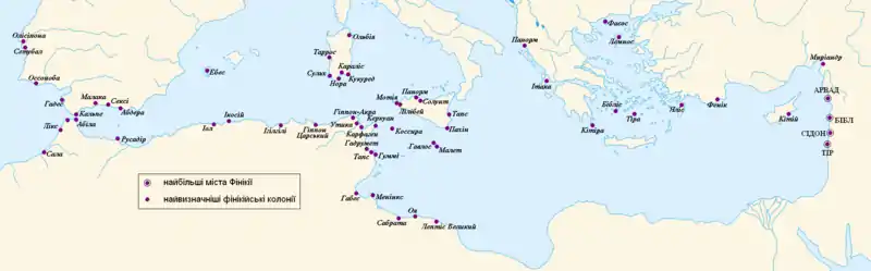 Вони не лише продавали свої товари по всьому Середземномор'ю, але й засновували свої колонії (поселення) в різних частинах регіону. Найбільшим з них було місто Карфаген в Північній Африці. У результаті активність Фінікійців спричинила конфлікт з греками, а потім і з римлянами. Легенди розповідають, що засновницею Карфагена була Фінікійська царівна Дідона. Коли вона зі своїми супутниками висадилася на березі Північної Африки, то звернулася до місцевого правителя з проханням виділити їй землю для будівництва міста. Той сказав, що вона може взяти стільки землі, скільки покриє одна бичача шкіра. Тоді Дідона наказала своїм людям розрізати шкіру на тонкі смужки, щоб таким чином отримати більше землі.