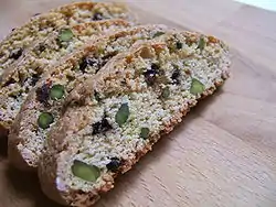 Зліва направо. Горіхи. Очищені горіхи (ядра). Хліб з фісташками. | ||||||||||