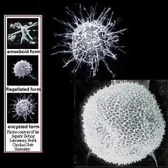 - Rublee PA, Remington DL, Schaefer EF, Marshall MM (2005). Detection of the Dinozoans Pfiesteria piscicida and P. shumwayae: a review of detection methods and geographic distribution. J. Eukaryot. Microbiol. 52 (2): 83–9. PMID 15817112. doi:10.1111/j.1550-7408.2005.05202007.x.