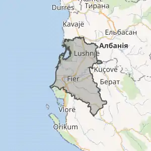 | Фієрі | Фієрі | 199 442 | 785 | Cakran, Dërmenas, Fier, Frakull, Kuman, Kurjan, Levan, Libofshë, Mbrostar, Patos, Portëz, Qendër, Roskovec, Ruzhdie, Strum, Topojë, Zharrëz |