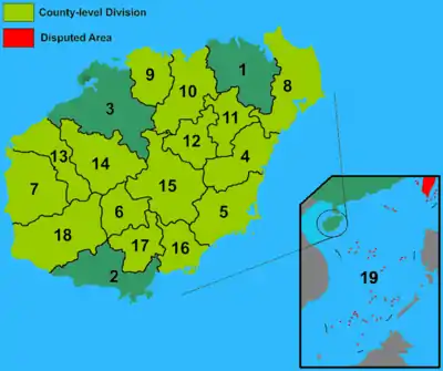 | 16 | Ліншуй-Ліський | 陵水黎族自治县 | Língshuĭ Lízú Zìzhìxiàn | |