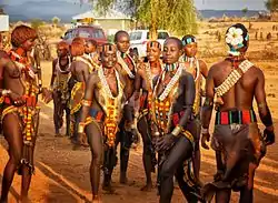 Чоловіки носять спідниці, множинні намиста на шиї, сережки, кількість яких говорить про числі його дружин. На поясі чоловіки носять ремені з безліччю кишеньок, зброю, що є ознакою достатку.