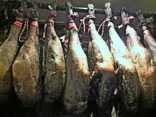 - Дозрівання. Після сушіння продукт переносять в льох, де класифікують за вагою і якістю. На підставі цієї класифікації визначається час, необхідний для дозрівання кожної ноги, після чого вони залишаються дозрівати, як і раніше в підвішеному стані. На цьому етапі завдяки мікроклімату погребів «ноги» набувають свій унікальний смак і аромат.