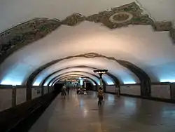 На платформі станції встановлені 9 світильників виконаних з білого мармуру і смальти (художник І. Ліпене).