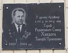 У Києві на будинку по бульвару Лесі Українки, 14, в якому з 1965 по 2004 рік жив Тимофій Хандога, в 2010 році встановлена гранітна меморіальна дошка[1].
