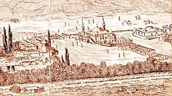 Фрагмент рисунка з гравюри першої половини XVII ст. Брами і світського корпуса ще немає[11]