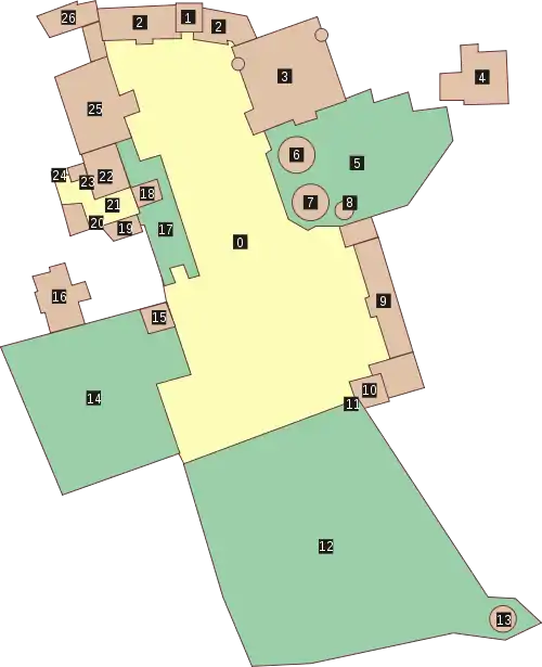 0 — Палацовий майдан; 1 — Північна брама і надбрамна башта; 2 — Світський корпус; 3 — Велика ханська мечеть; 4 — Лазня Сари-Ґюзель; 5 — Ханський цвинтар; 6 — Північне дюрбе; 7 — Південне дюрбе; 8 — Ротонда Менґлі II Ґерая; 9 — Стаєнний корпус; 10 — Бібліотечний корпус; 11 — Південна брама; 12 — Садові тераси; 13 — Дюрбе Діляри-бікеч; 14 — Перський сад; 15 — Соколина вежа; 16 — Гаремний корпус; 17 — Басейний дворик; 18 — Літня бесідка (на першому поверсі) і Золотий кабінет (на другому поверсі); 19 — Мала ханська мечеть; 20 — Золотий фонтан; 21 — Фонтанний дворик; 22 — Зала Дивану; 23 — «Фонтан Сліз»; 24 — Портал Демір-Капи; 25 — Житлові покої; 26 — Кухонний корпус.