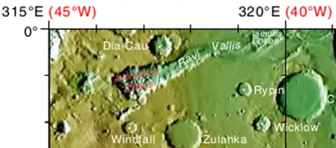 ![]() Aromatum Chaos та Ravi Vallis, знімок виконано орбітальним апаратом «Вікінг» | |