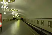 Внутрішній підземний простір станції повністю розкрито завдяки застосуванню залізобетонних конструкцій, внаслідок чого середній і бокові касові зали зливаються в єдиний простір. Назва станції зроблена з граніту в облицюванні колійної стіни, тому перейменування їй не загрожують.