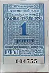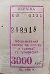 Абонементний квиток на проїзд в трамваї та тролейбусі. Вартість 3000 карбованців. | 1995 рік |