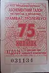 Абонементний талон на проїзд у міському трамваї, тролейбусі. Вартість 75 копійок. | 2008 рік |