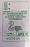 Разовий квиток на проїзд у міському тролейбусі. Вартість 2 гривні. | |