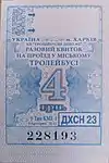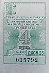 Разовий квиток на проїзд у міському тролейбусі. Вартість 4 гривені. КП «Тролейбусне депо №2» | |