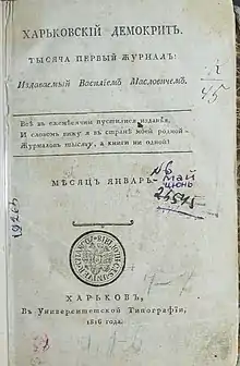 Харківський Демокрит — гумористично-сатиричний журнал, який видавався у Харкові у 1816 році. Засновник часопису харківський поет Василь Маслович, який залучив до роботи над виданням чимало людей, які стали пізніше відомими далеко за межами Слобожанщини — Грігорія Квітку (котрий на той час ще не взяв собі псевдоніму «Основ'яненко»), Акіма Нахімова, Івана Срезневського, Розумника Гонорського, Ореста Сомова, Івана Паліцина. Матеріали у часописи ділилися на три частини — «поезія, проза, суміш», загальний напрямок був сатиричний, але без політичної забарвленості. У прихованій формі критикувалося кріпацтво та інші вади тогочасного суспільно-політичного ладу, крім того, містилося багато матеріалів, пов'язаних з гострими повсякденними питаннями життя Харкова. Представлений також був жанр літературної пародії. «Харківський Демокрит» видавався російською мовою, проте твори, пов'язані з минулим або тогочасним життям Слобожанщини, вміщали багато українізмів, пізніше у часописі з'явилося кілька творів, цілком написаних українською мовою — які належали перу Василя Масловича[1]. Харківський Демокрит був першим часописом, який виходив на території України, першим часописом, де була вжита українська мова та першим суто гумористичним виданням у Російській імперії[2]. Видання часопису було припинено у червні 1816 року, про що читачів проінформували три слова "Кончина «Харьковского Демокрита», надруковані на останній сторінці. Незважаючи на короткий час видання, часопис мав великий вплив на інтелектуальне життя Слобожанщини та Лівобережної України загалом, у ньому розпочали свою літературну діяльність Григорій Квітка, Орест Сомов, Акім Нахімов. Традиція «Харківського Демокрита» була пізніше продовжена в «Українському Віснику». Деякі твори, вперше надруковані на сторінках «Харківського Демокриту», пізніше виходили окремими виданнями.