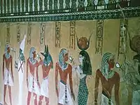 Хатхор в ряду божеств, які вітають покійного фараона Тутмоса IV, на стінах його гробниці в Долині царів