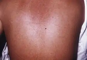 ![]() Плямисто-папульозний висип на спині у хворого на гарячку Марбург (ПАР, 1975 р.) Плямисто-папульозний висип на спині у хворого на гарячку Марбург (ПАР, 1975 р.) | |