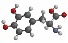 Діоксифенілаланін (ДОФА)[14] — біогенна речовина, яка утворюється в організмі з тирозину і є попередником дофаміну, який, в свою чергу, є попередником норадреналіну. У зв'язку з тим, що при хворобі Паркінсона вміст дофаміну в головному мозку значно знижений, для лікування захворювання доцільне застосування речовин, що підвищують його вміст у центральній нервовій системі. Сам дофамін не може бути використаний для цієї мети, оскільки він погано проникає через гематоенцефалічний бар'єр.