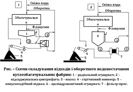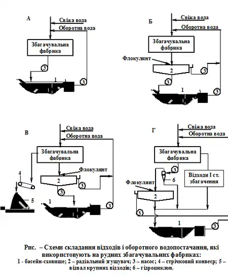 Принципам укладання відходів і оборотного водопостачання задовольняють наступні схеми (рис. 1), які застосовуються на існуючих і проектованих гірничозбагачувальних підприємствах.