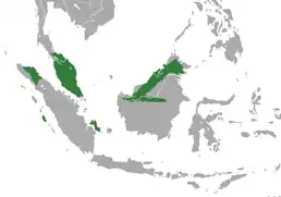 Батьківщина цієї тварини — Малайський півострів, Суматра, північна і західна частина Борнео, а також прилеглі невеликі острови. Середовище проживання виду — це ліси на висоті до 1000 метрів над рівнем моря.