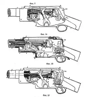 Добре видно складні допоміжні механізми, які здійснюють подачу набоїв і викид стріляних гільз.