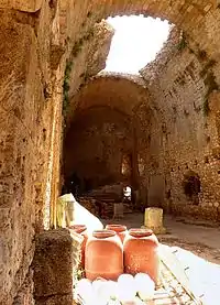 Донжон має форму неправильного шестикутника, близько 90 м зі сходу на захід, близько 60 м з півдня на північ, його шість стін оточують внутрішній дворик розмірами 61×31 м.[24] У його стінах містяться серії двоповерхових залів, що формують кільце кімнат навколо центрального внутрішнього дворику. Нижній поверх, відділений від верхнього дерев'яною підлогою — що здебільшого впала, і лише ніші для підтримки балок свідчать про її колишнє існування — має арки, що відкриті в сторону внутрішнього дворику. Верхній поверх має галереї з яйцеподібними циліндричними склепіннями «з бездоганним облицюванням пороським каменем» (Ендрюс), що підтримуються боковими стінами з блоків вапняку, з регулярно кожні 7-10 м розташованими поперечними арками. Вони всі обвалились, окрім пілястр, вбудованих в стіни, на верхівках яких розміщено імпости з фасками у візантійському стилі.[30]