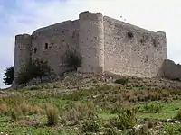 Вхід до донжону розташовувався в ризаліті з північного боку, зі склепінчастим проходом між двома ворітьми, що вели з зовнішнього двору до внутрішніх кімнат донжону.[32] Сам донжон має лише дві круглі вежі по 5 м у діаметрі з квадратними основами, обидві з яких розташовані з західного боку, у межах форбургу. Південіша з двох веж зараз майже повністю зруйнована, скоріш за все в результаті пошкоджень нанесених Ібрагім-пашею. Більш відкриті східна та південна сторони не мають веж. На думку історика Кевіна Ендрюс, це, скоріше за все, пояснюється тим, що адекватний захист з цих сторін передбачався завдяки крутизні поверхні.[33]