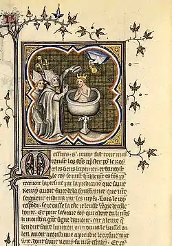 Хрещення Хлодвіга теж оточене всілякими незвичайними розповідями. За однією з них, святому Ремігію з'явився ангел у вигляді голуба і приніс посудину з миррою (фр. sainte ampoule) для хрещення Хлодвіга. Пізніше майже всі королі Франції помазувались на королювання саме миррою з цього флакону. Григорій Турський про це диво в «Історії франків» не згадує. Ймовірно «батьком» легенди був архієпископ Реймса Гінкмар (фр. Hincmar, біля 806—882 рр.).